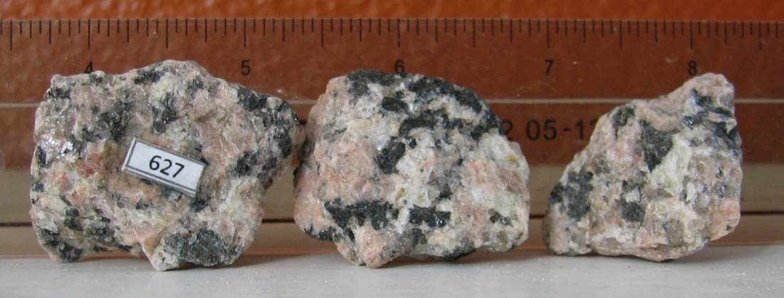 This is similar to the intrusive igneous rock of our Sierra Nevada batholith. (note the lack of the peach-colored mineral potassium feldspar)